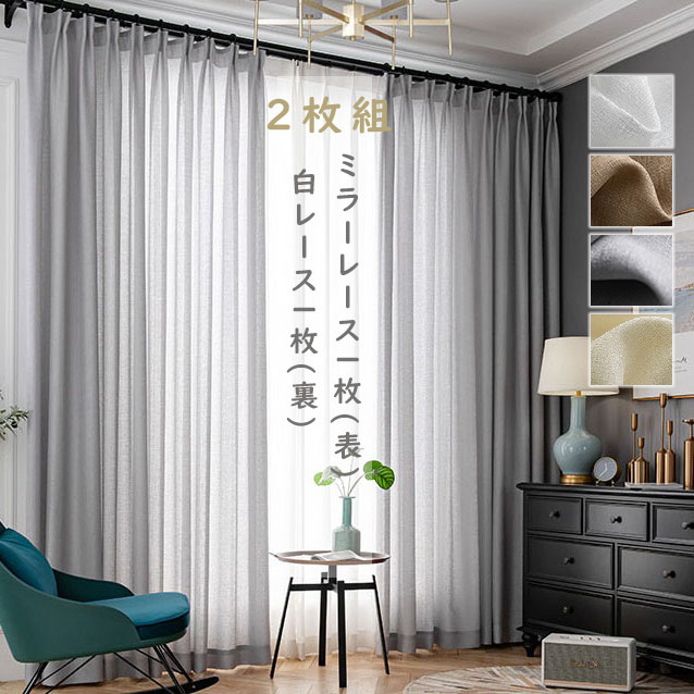 【2枚組】 ミラーレース1枚(表)+白レース1枚(裏) 遮像 防塵 全4色 花粉防虫 UVカット プライバシー保護 おしゃれ 昼夜透けにくい 2倍ヒダ