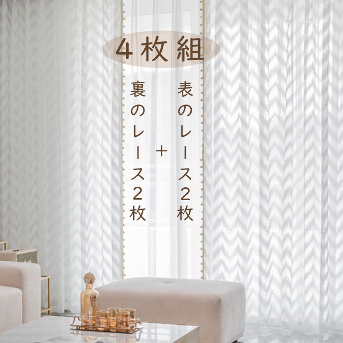 【4枚組】表レース2枚+裏レース2枚 清潔感ありのホワイト おしゃれ 上品さたっぷり しっかり遮像 レースカーテンセット 2倍ヒダ