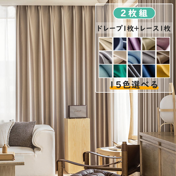【2枚組】遮光 カーテン 全9色 おしゃれ 1級遮光 UVカット 断熱保温 シンプル 無地 高級感 ドレープ+レース セットカーテン 2倍ヒダ
