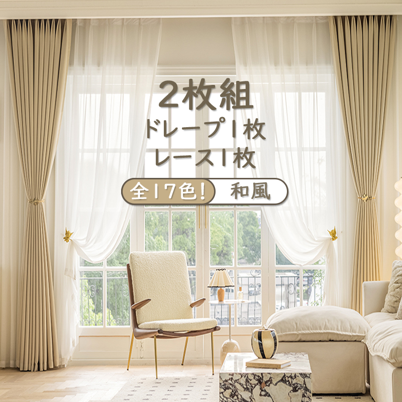 【2枚組】和風 シンプル おしゃれ クリーム系 無地12色+切り替え5色 遮光1級 保温 断熱 防音 厚地 UVカット リビング 寝室 和室 ドレープ+レース セットカーテン 2倍ヒダ