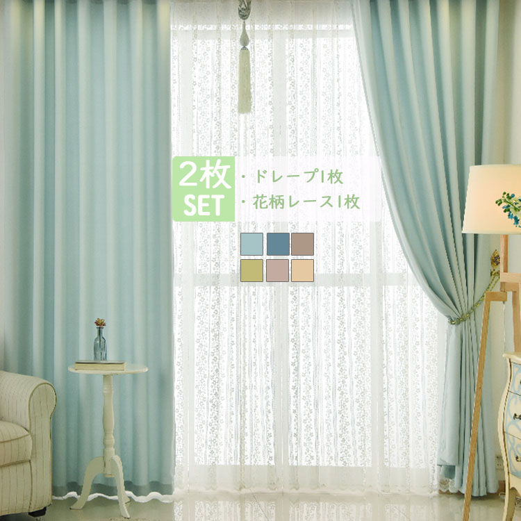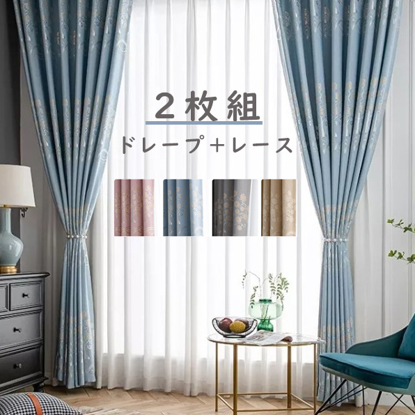 【2枚組】遮光カーテン おしゃれ フランス風&シンプルデザイン 全8色 遮光1級 防寒 保温 UVカット 目隠し 厚地 ドレープ+レース セットカーテン 2倍ヒダ