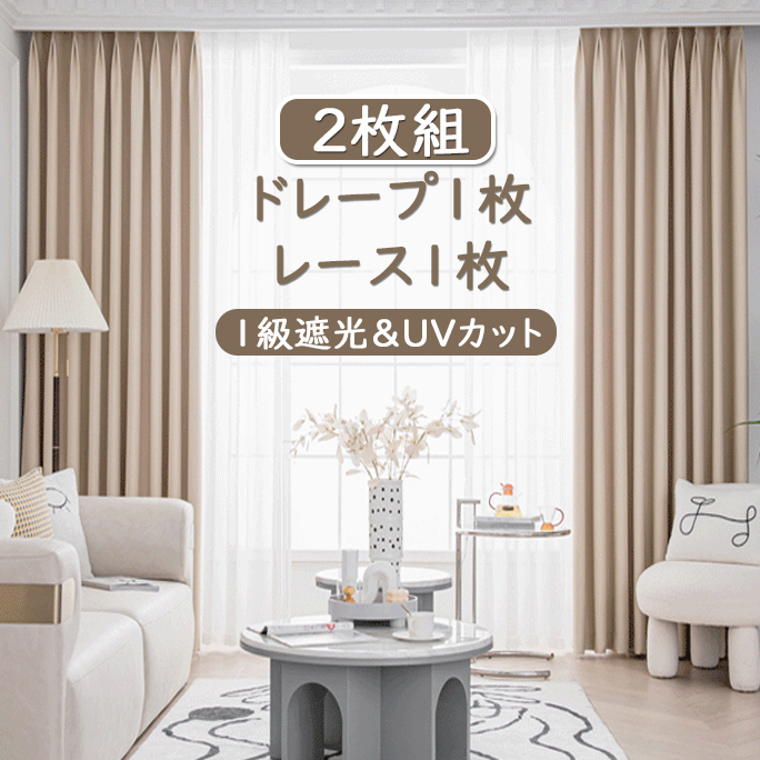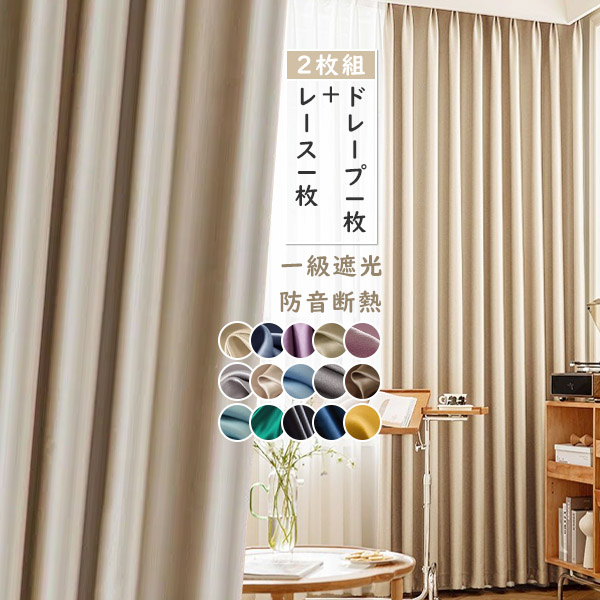 【2枚組】おしゃれ クリーム系 洋室&和室 全14色 遮光1級 シンプル 無地 UVカット 防音断熱 ドレープ+レース セットカーテン 2倍ヒダ