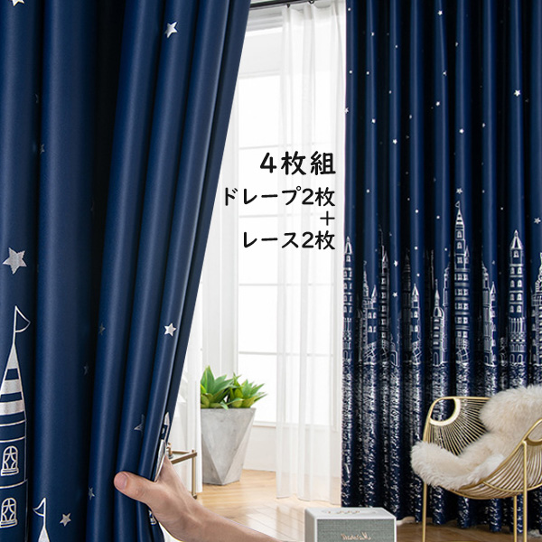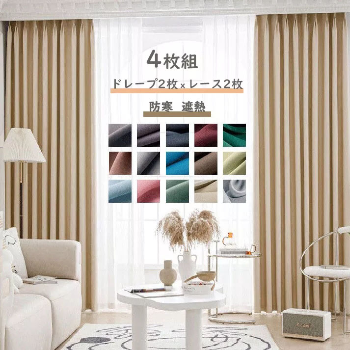 【4枚組】シンプルドレープ2枚+レース2枚 プリント 保温カーテン 良い垂れ感 おしゃれ度高め 防音 遮光カーテン2倍ヒダ