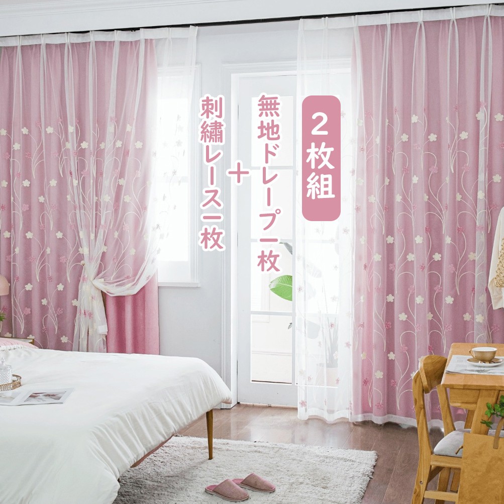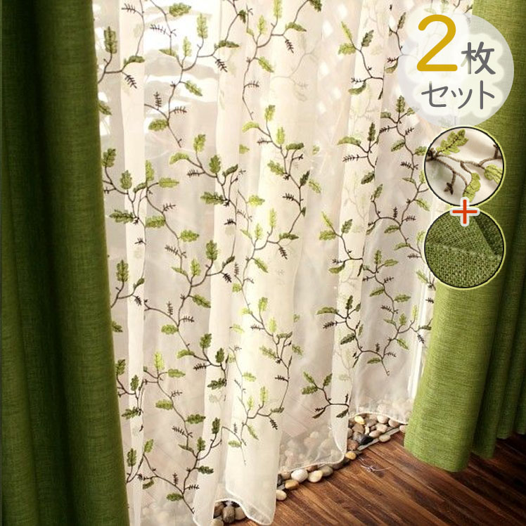 【2枚組】合わせやすい 2級遮光 刺繡 花柄 綿麻 ドレープ1枚&レース1枚 人気商品 厚手カーテン おしゃれ シンプル 垂れ感 防音 遮光カーテン 2倍ヒダ
