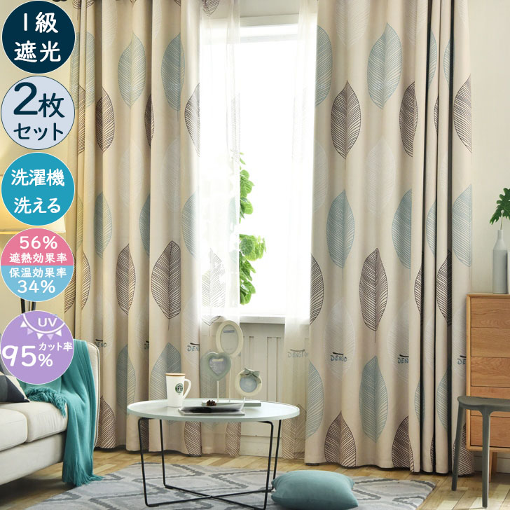 【2枚組】北欧 葉柄 リーフ 2色 遮光1級 遮熱 防音 保温 ドレープ1枚&レース1枚 セットカーテン 2倍ヒダ