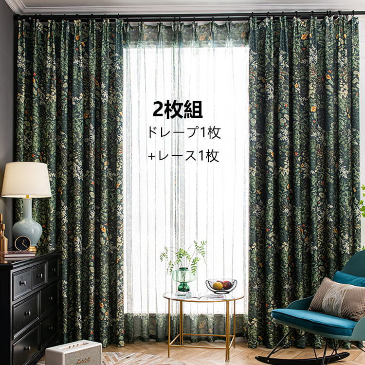 【2枚組】 ボタニカル柄 おしゃれ モダン シンプル 遮光 ドレープ1枚&レース1枚 セットカーテン 防寒 防音 遮熱 2倍ヒダ