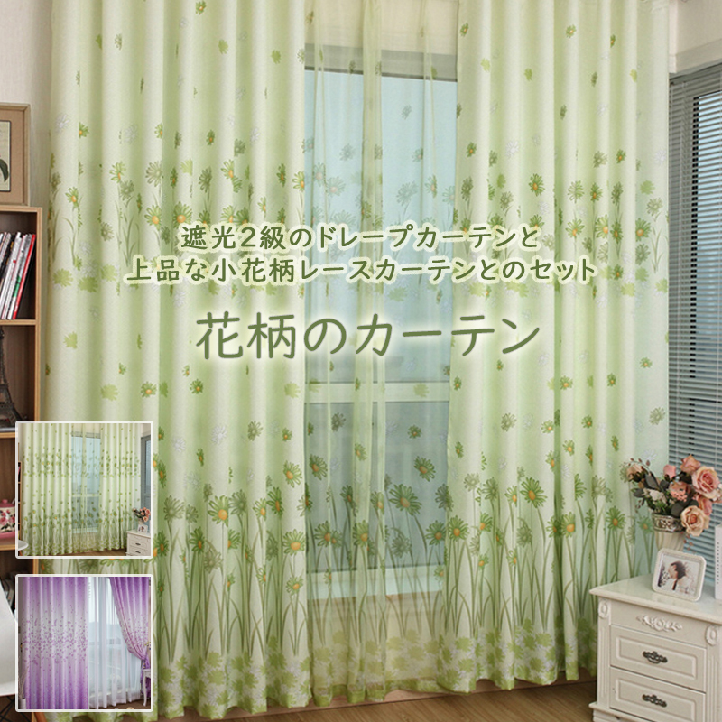 【2枚組】アメリカ式 お花柄 プリント セット 遮光2級 ドレープ1枚 + レース1枚 洗える カーテン おしゃれ カーテン おすすめ カーテン 2倍ヒダ
