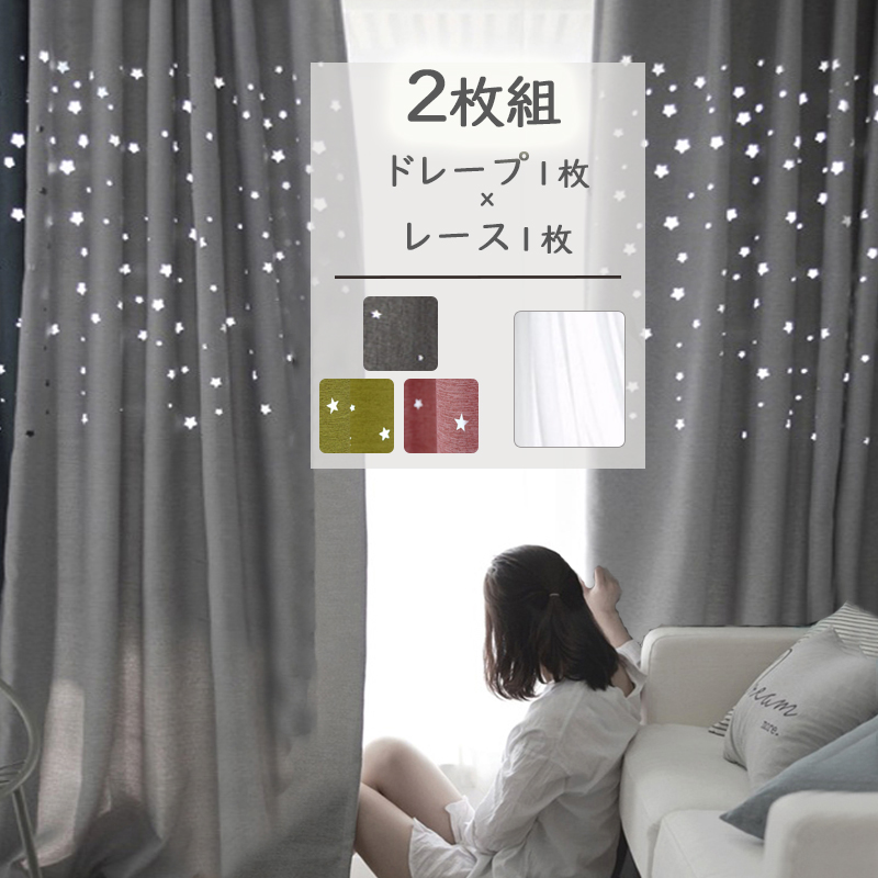 【2枚組】透かし彫り 輝くの星月柄 おしゃれな3色 高機能 遮光1級 遮熱 保温 セットカーテン 2倍ヒダ