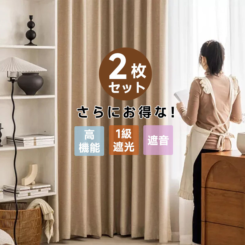 【2枚組】1級遮光 おしゃれな6色 無地 高機能 遮音 断熱保温 ドレープカーテン 2倍ヒダ