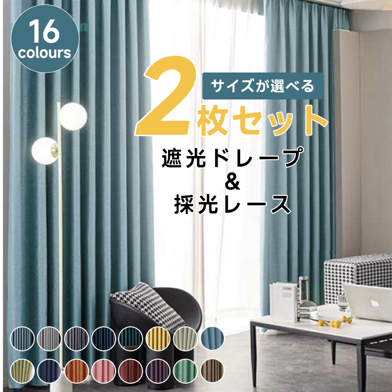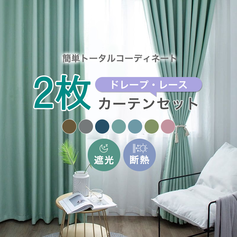 【2枚組】人気 定番な7色 無地 遮光カーテン 遮熱保温 防汚 UVカット おしゃれ ドレープ1枚&レース1枚 カーテンセット 2倍ヒダ