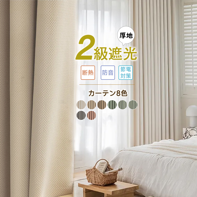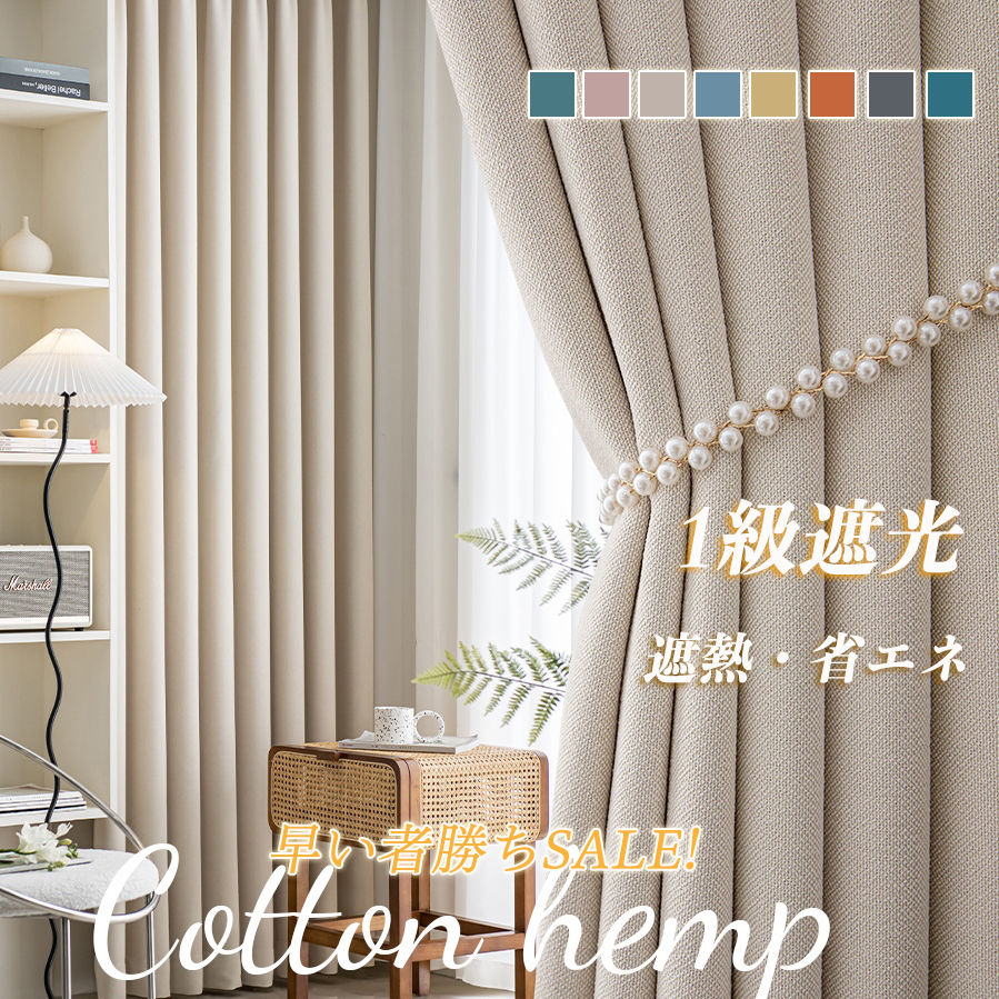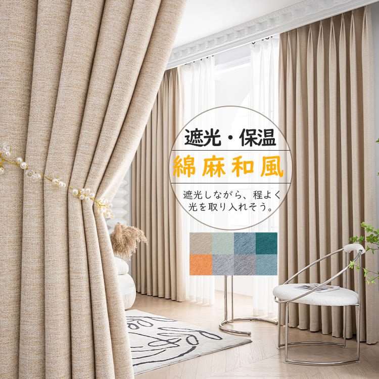 綿麻 2級遮光 厚地 断熱 防音 節電対策 ドレープ カーテン リビング 寝室 シンプル カーテン 2倍ヒダ