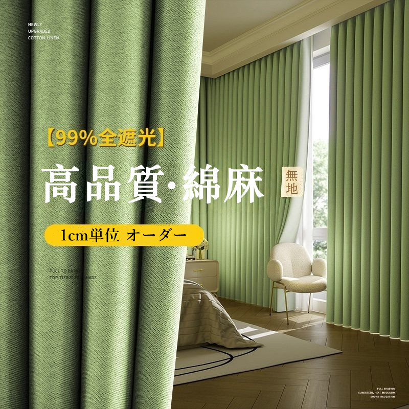 引っ越し 新居 1cm単位 オーダー おしゃれ 7色展開 無地 和洋兼用 癒し効果 綿麻カーテン 遮光2級 防寒 断熱 保温 冷暖房効率UP ドレープ カーテン 2倍ヒダ