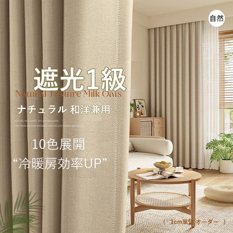 ナチュラル 定番シンプル 10色展開 和洋兼用 精密縫製 無地 遮光1級 防寒 断熱 保温 冷暖房効率UP 優れた垂れ感 洗える 1cm単位 オーダー ドレープ カーテン 2倍ヒダ
