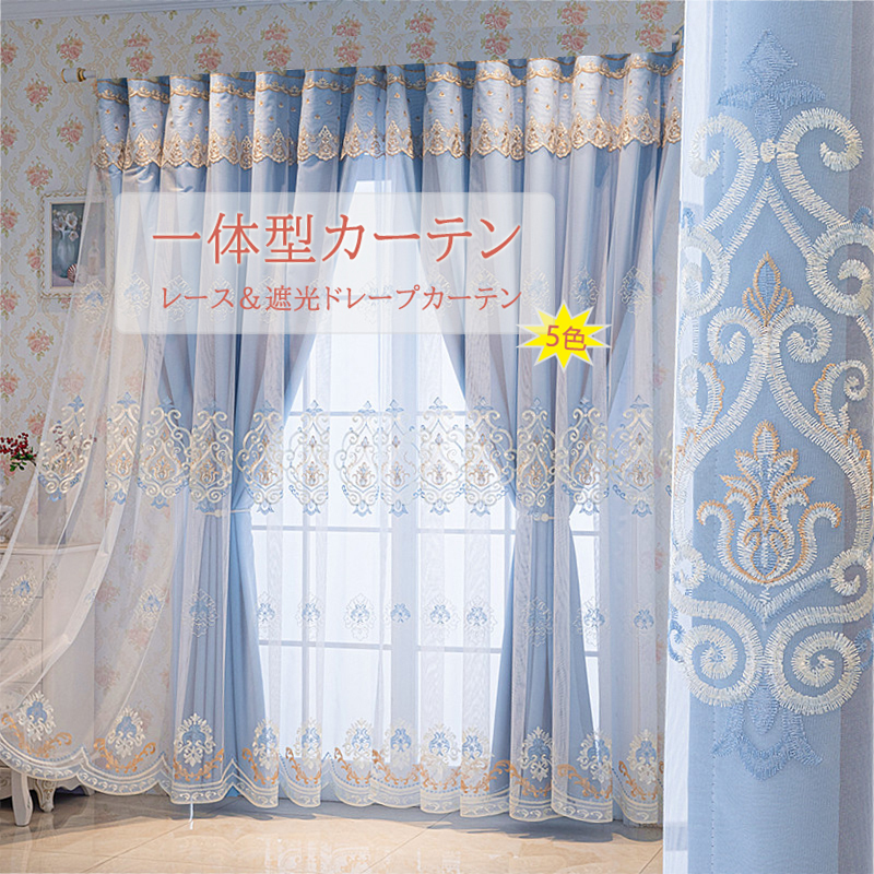 全5色 お姫系 フランス風 刺繍入り 遮光1級 2重デザイン 防音 断熱 高級感たっぷり 良い垂れ感 1cm単位 オーダー ドレープ&レース 一体型カーテン 2倍ヒダ