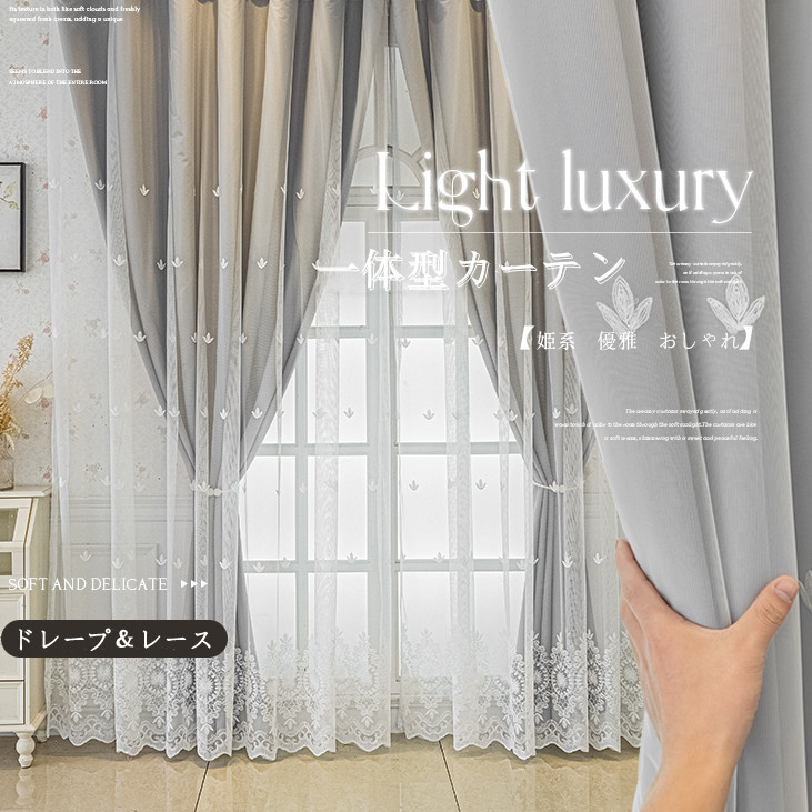 一人暮らし 姫系 人気商品 2重デザイン 遮光1級 UVカット 防音遮音 省エネ 遮熱保温 上品 刺繡 ドレープ+レース 一体型カーテン 2倍ヒダ