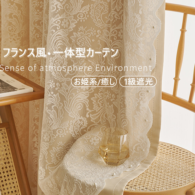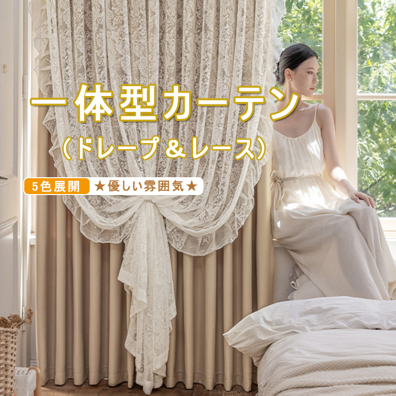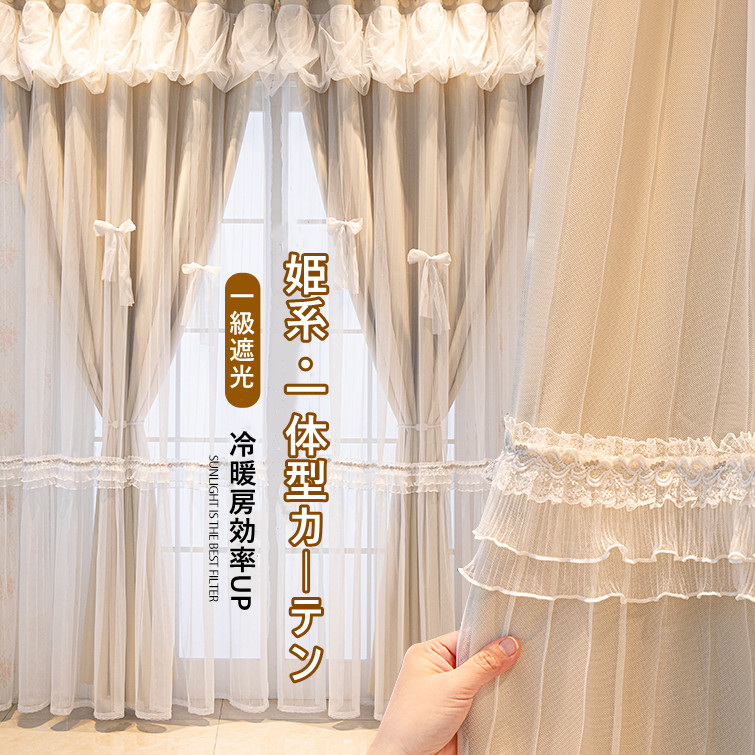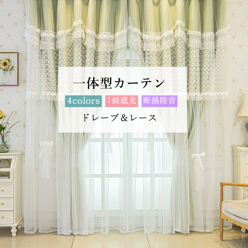 1級遮光 かわいい レース付 防寒 冷気遮断 おしゃれ UVカット 節電対策 2重デザイン 姫系カーテン ドレープ&レース 一体型カーテン 2倍ヒダ