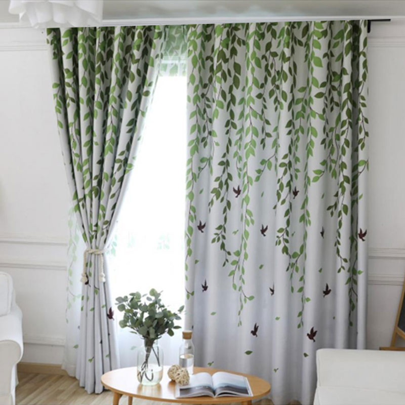 【ドレープ】北欧風 おしゃれ 葉 小鳥柄 洗える 断熱 遮光カーテン 2倍ヒダ