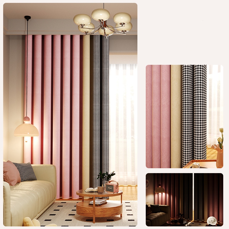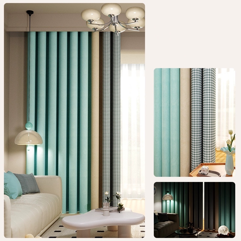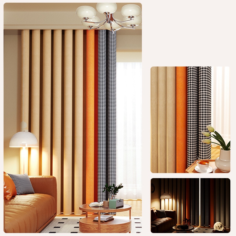 千鳥格子柄 切り替え 綿麻 配色 いい垂れ感 オーダーカーテン 遮光1級 防寒 保温 UVカット 遮熱 節電対策 リビング 寝室 シンプル 北欧風 厚地 ドレープカーテン 2倍ヒダ