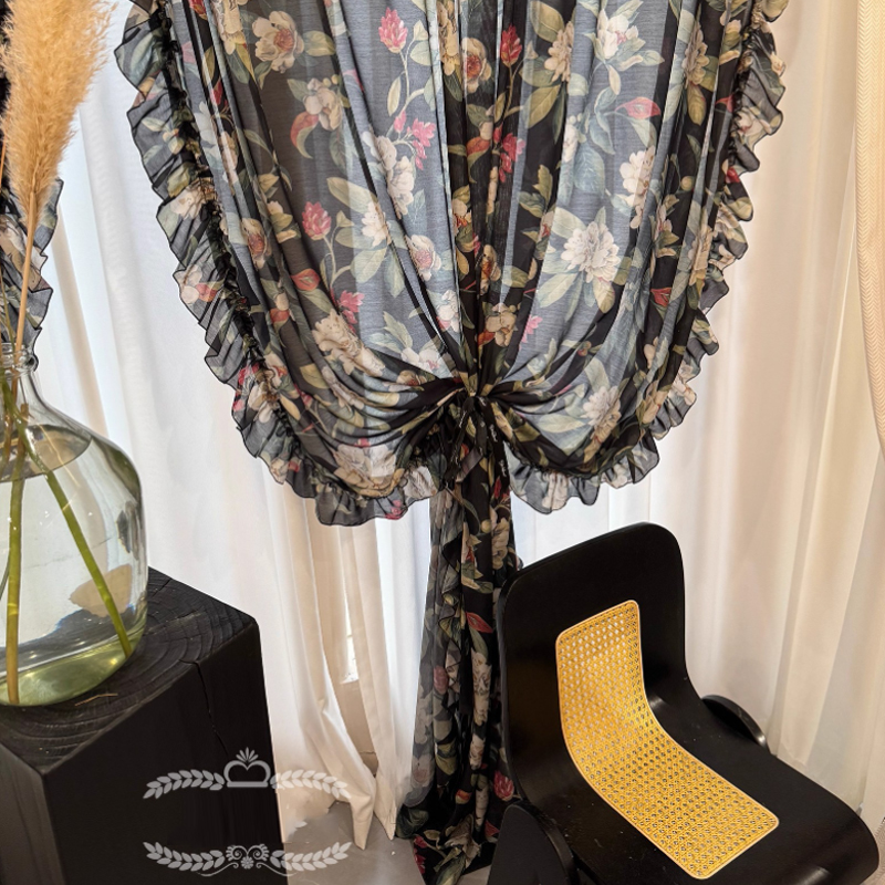 おしゃれ 花柄 フリル付き 北欧風 田園風 癒し効果 姫系 遮像 プライバシー保護 UVカット 日焼け防止 ナチュラルな垂れ感 1cm単位 オーダー レースカーテン 2倍ヒダ