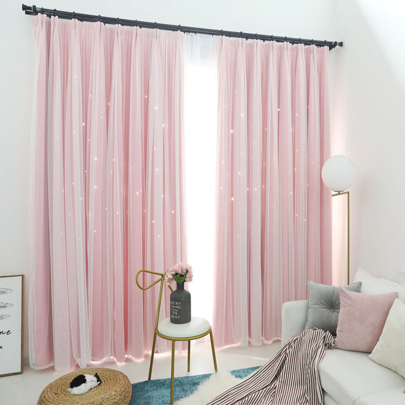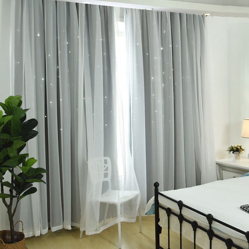 おしゃれ 韓国風 おすすめ 姫系 かわいい 星柄 透かし彫り星 遮光2級 寝室 快適 一体型カーテン 2倍ヒダ