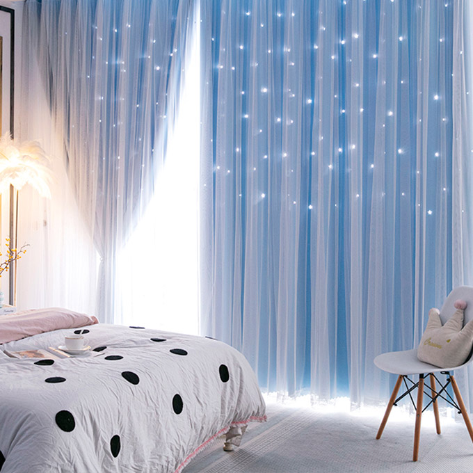 おしゃれ 可愛い星柄の透かし彫りデザイン 大人気姫系 二重 遮光 ドレープ+レース 一体型カーテン 2倍ヒダ