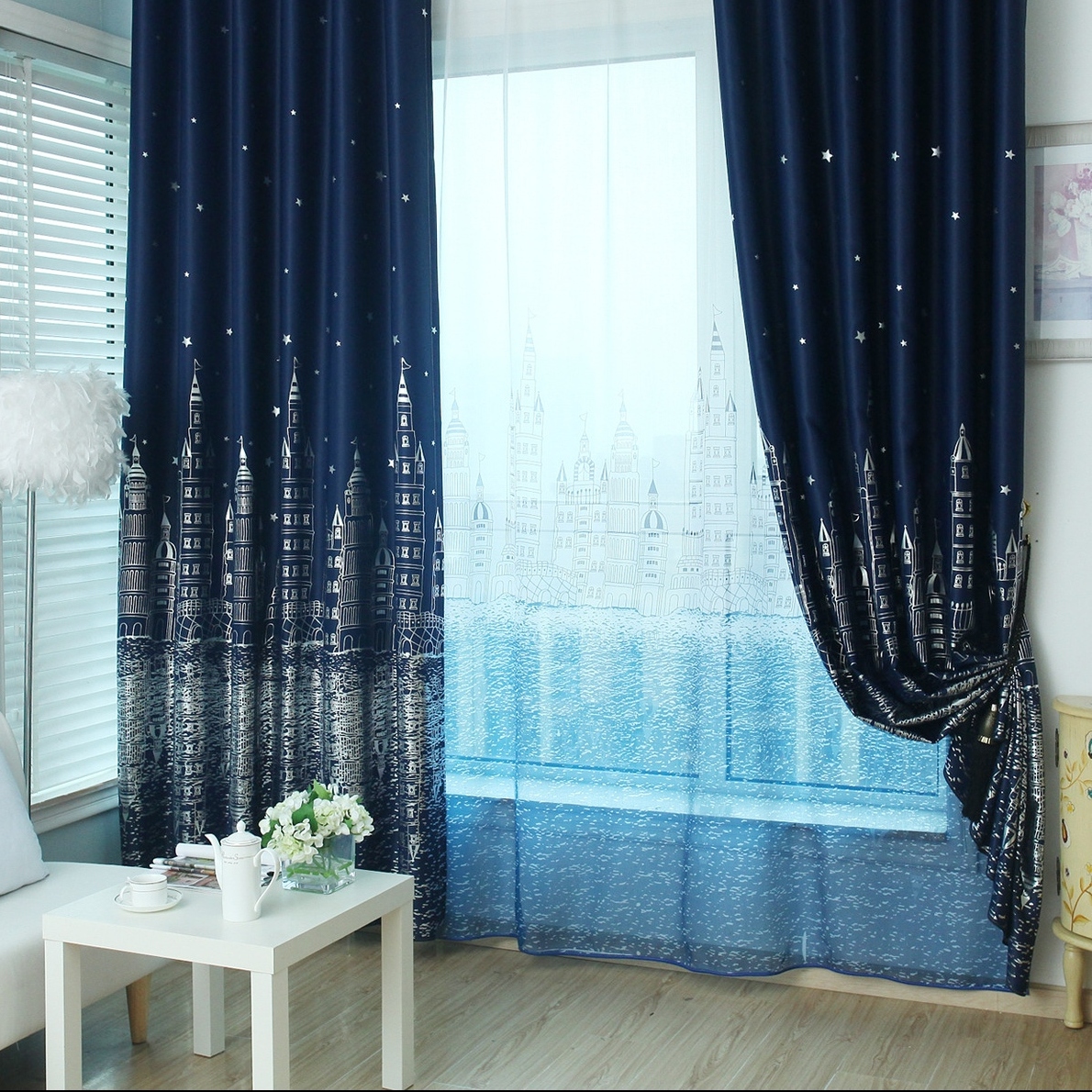 【2枚組】子供部屋 可愛い 城 星柄 カートゥーン ドレープ1枚&レース1枚 カーテンセット 2倍ヒダ