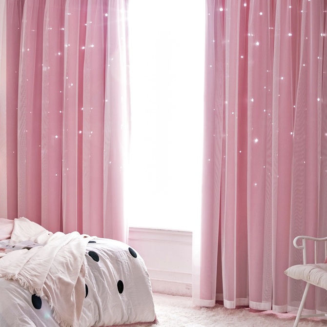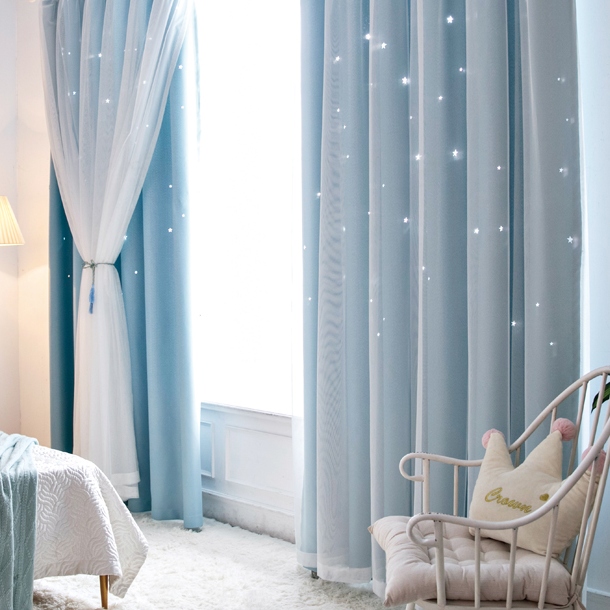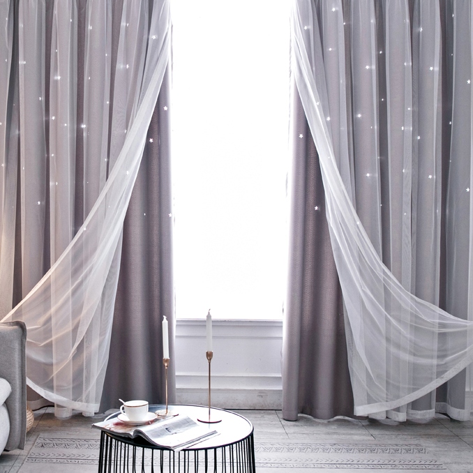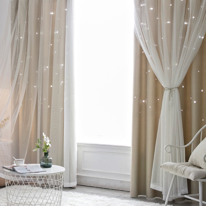 ins超人気 キラキラ透かし彫り星柄 おしゃれ 2級遮光 一体型カーテン 2倍ヒダ