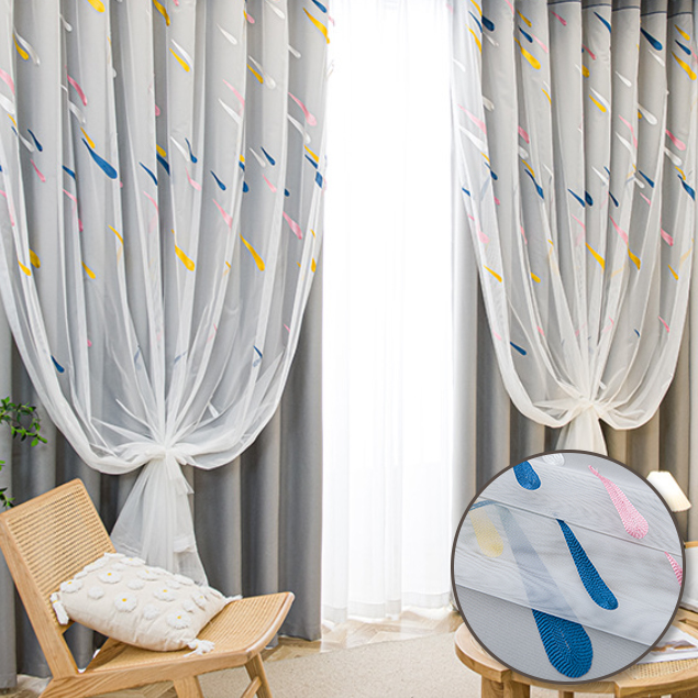 おしゃれ 可愛い流星柄 プリント 活力 寝室 子供部屋 1級遮光 防寒断熱 ドレープ+レース 一体型カーテン 2倍ヒダ