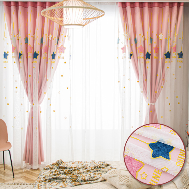 プリンセス風 おしゃれ 可愛い星柄の刺繍 大人気姫系 1級遮光 防寒断熱 ドレープ+レース 一体型カーテン 2倍ヒダ