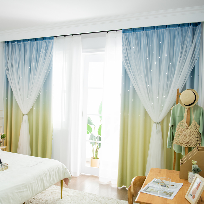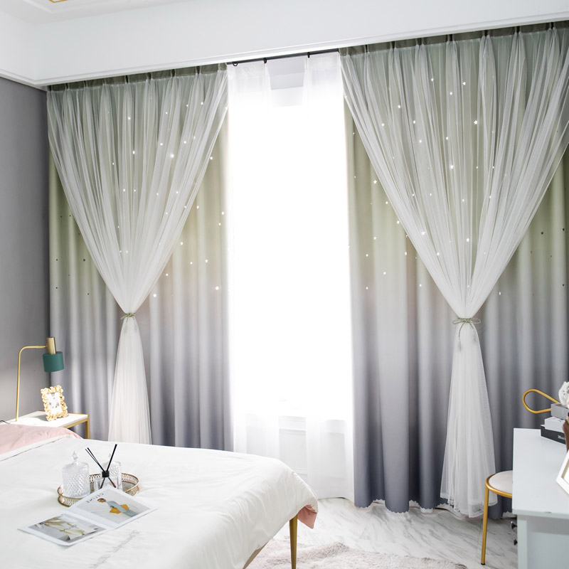 2重デザイン プリンセス 北欧風 おしゃれ グラデーション×星デザイン 遮光遮熱 保温防音カーテン 素材感 一体型カーテン 2倍ヒダ