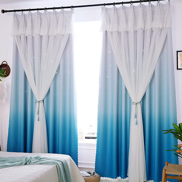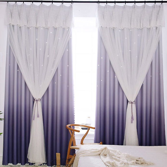 グラデーション色 おしゃれ 2重デザイン お姫系 透かし彫り星 ドレープ&レース一体型 遮光2級 遮熱保温 カーテン 2倍ヒダ