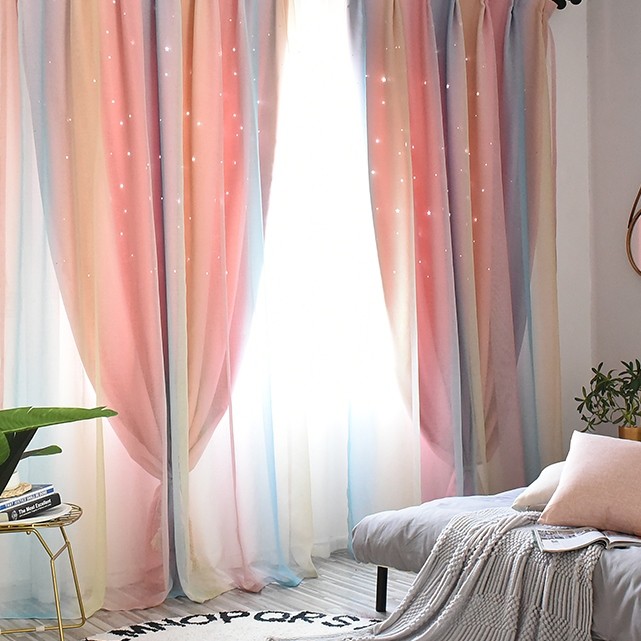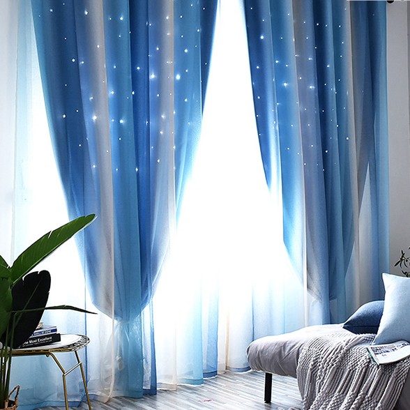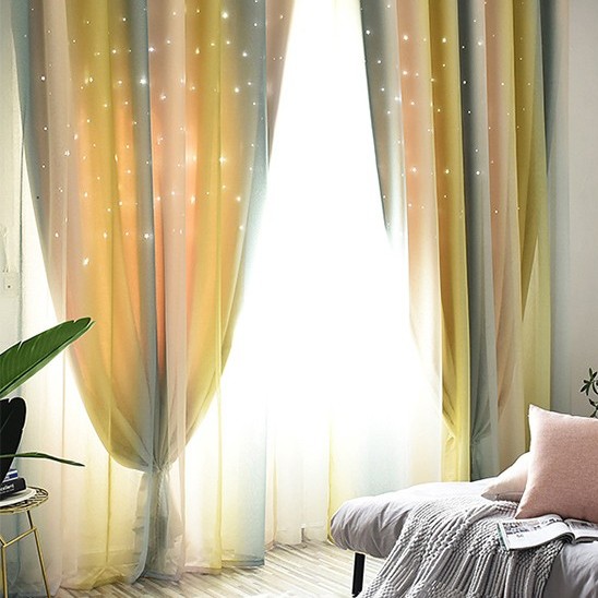 【一体型】星透かし彫り×グラデーションデザイン ドレープとレース一体型カーテン 遮光2級 2倍ヒダ