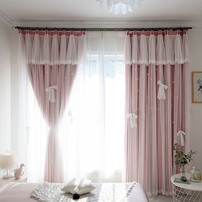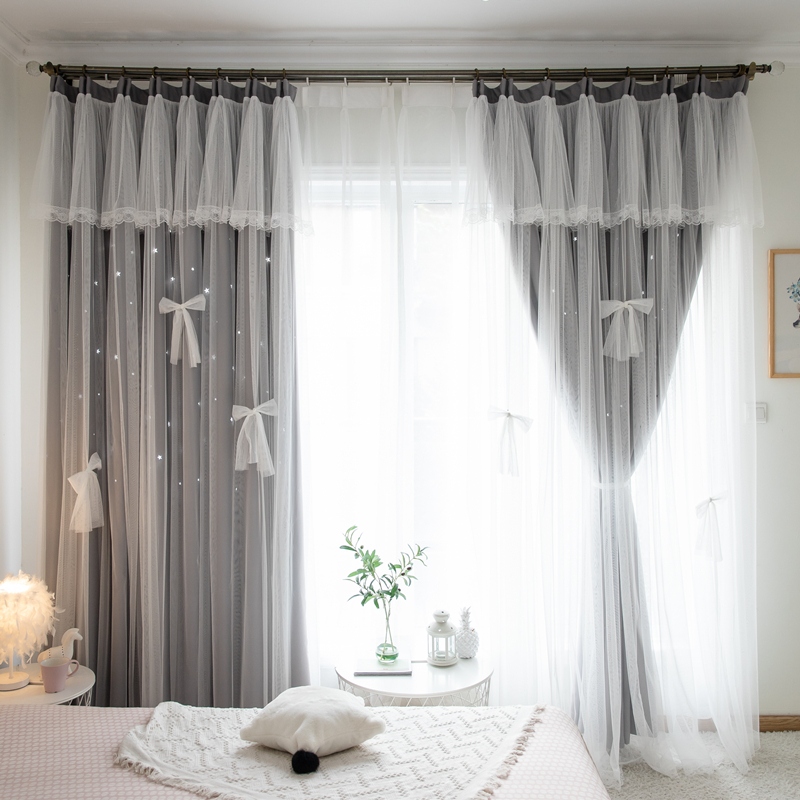 【一体型】キラキラ透かし彫り星柄 ドレープとレース一体型カーテン 遮光1級 2倍ヒダ