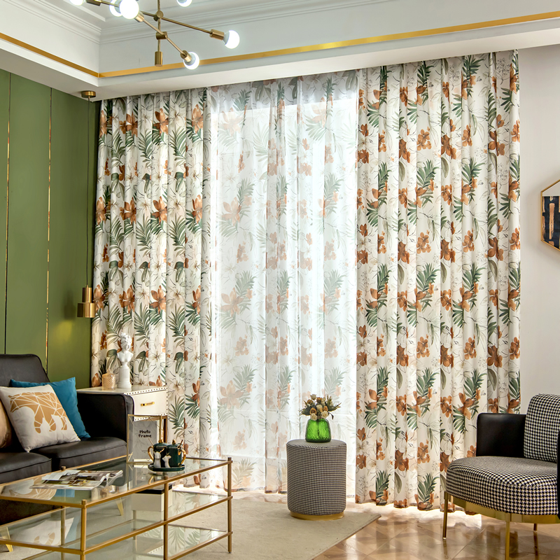 【2枚組】花柄 おしゃれ アメリカ田園風 ドレープ1枚&レース1枚 垂れ感 半遮光 カーテン 2倍ヒダ