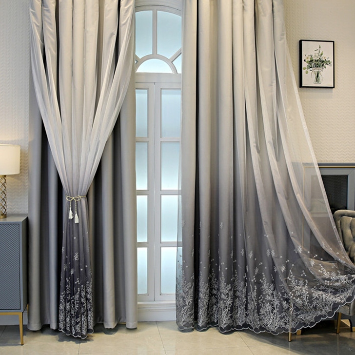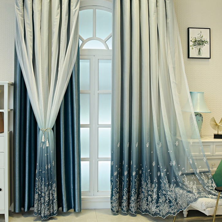 【一体型】エレガントな刺繡デザイン グラデーション 遮光カーテン 2倍ヒダ