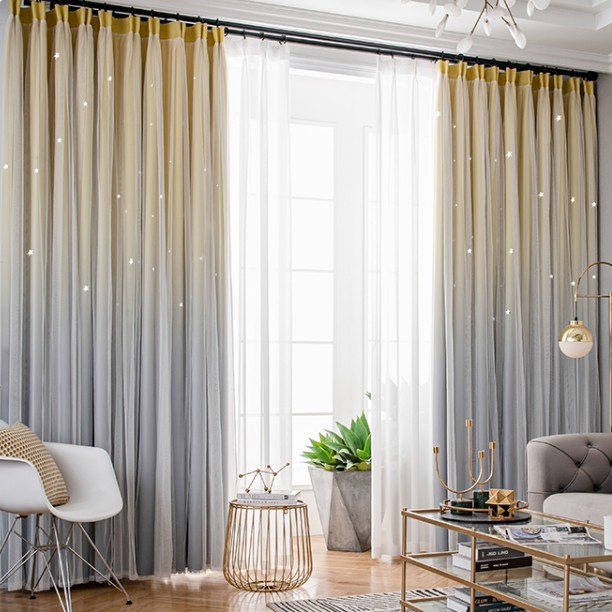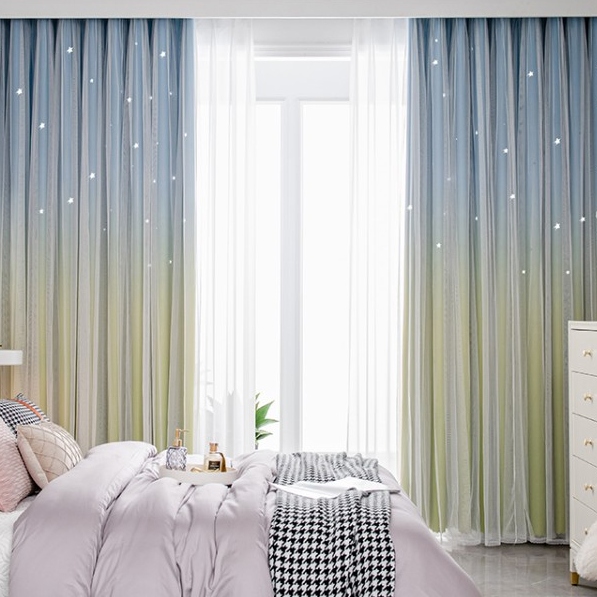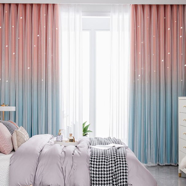 【一体型】おしゃれ グラデーション色 お姫系 透かし彫り星 遮光遮熱 防音カーテン 2倍ヒダ