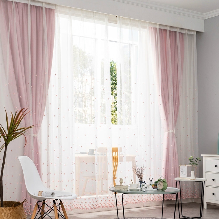 【2枚組】 セットカーテン おしゃれ お姫系 可愛い ピンク リビング 寝室 ドレープ1枚&レース1枚 2倍ヒダ