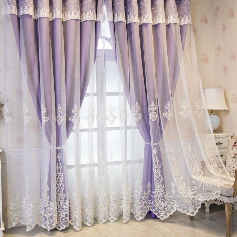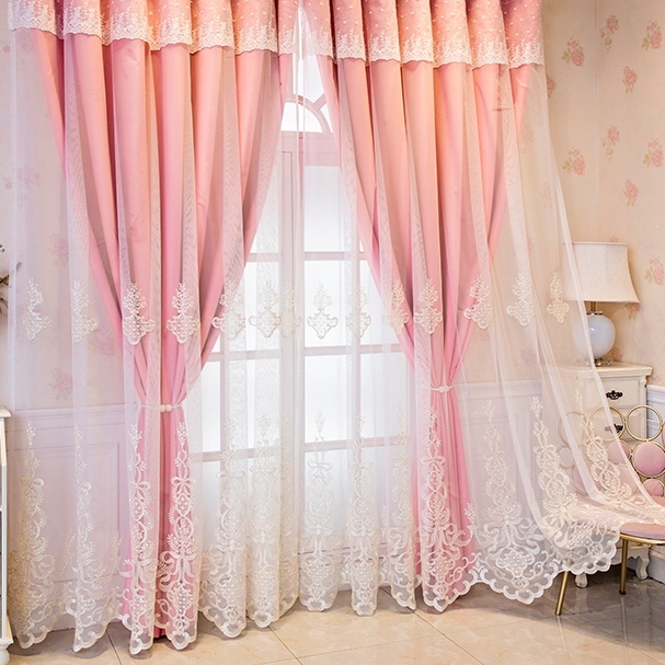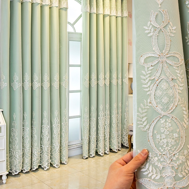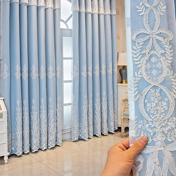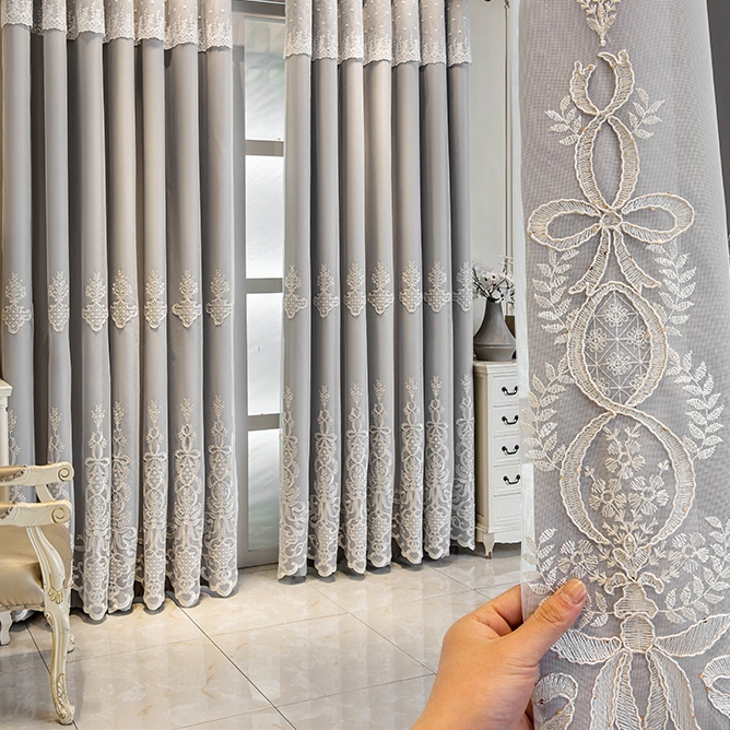 北欧風 エレガントな刺繍入り 5色 断熱保温 防音遮音 厚地 1級遮光 ドレープ&レース一体型カーテン 2倍ヒダ